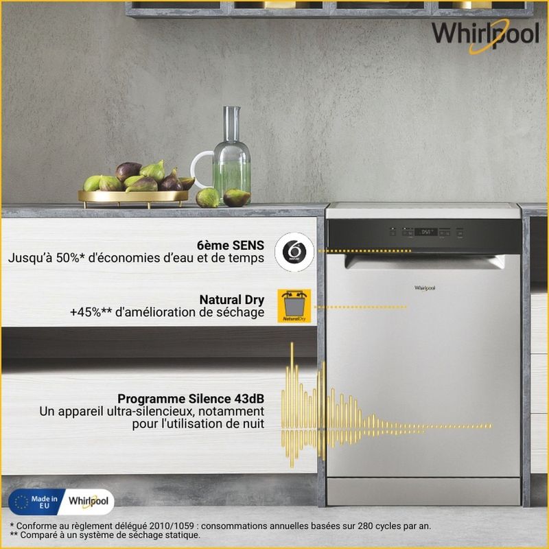 Ce lave-vaisselle inox WFC3C34X de la marque WHIRLPOOL est performant et son bandeau intuitif vous facilitera la vie. Grâce à la technologie 6ème sens, vous obtiendrez une vaisselle parfaitement propre et sèche sans effort tout en économisant jusqu'à 50 % d'eau, d'énergie et de temps. De plus, son option NaturalDry garantit une performance de séchage jusqu'à 70% supérieure à un système de séchage classique.