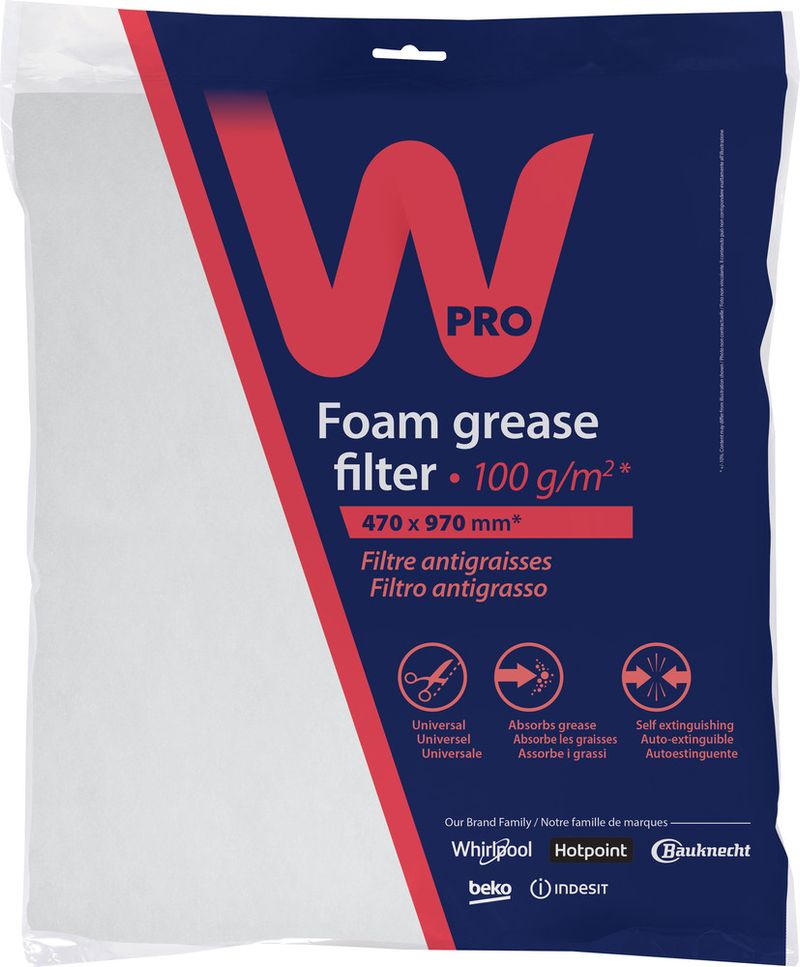 Le filtre à graisse universel en papier feutré Wpro protège votre cuisine des vapeurs de graisse qui se répandent pendant la cuisson. Remplacer le filtre tous les 3 mois afin de maintenir un bon niveau de filtration. Il est Auto-extinguible. Dimensions : 470 x 970 mm - 100 g/m². Coupez-le ou superposez-le pour ajuster à la taille de votre Hotte.