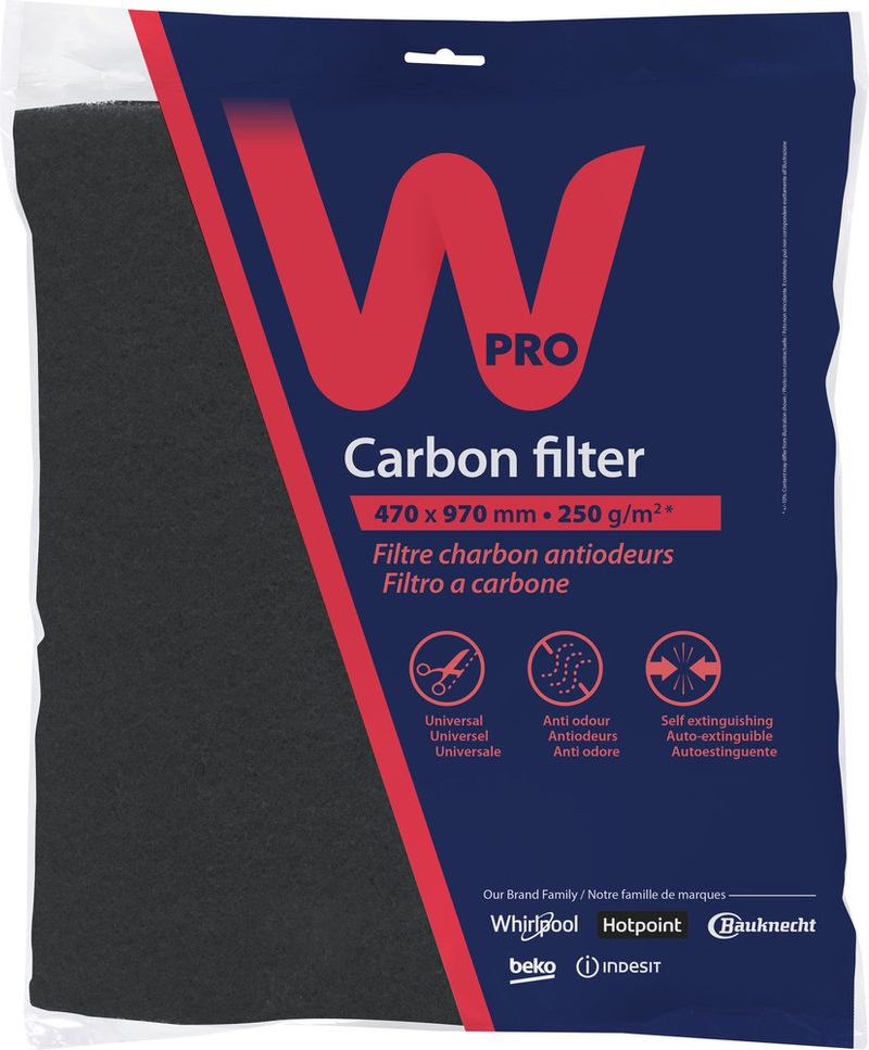 Le filtre à charbon universel Wpro absorbe la graisse et l'humidité pendant la cuisson, évitant les odeurs désagréables dans la cuisine. Pour maintenir un bon niveau de filtration, nous recommandons de changer le filtre tous les 3 mois. Il est Auto-extinguible. Dimensions : 470 x 970 mm - 250 g/m². Coupez-le ou superposez-le pour ajuster à la taille de votre Hotte.