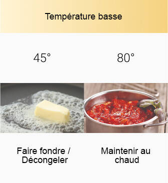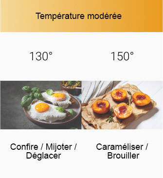 Il vous suffit de sélectionner la température qui convient le mieux à votre recette (au lieu du niveau de puissance) et la table de cuisson s'assurera que votre plat est cuit à la perfection. Une fois la température réglée, des capteurs spéciaux la maintiennent stable pendant toute la durée de la cuisson.