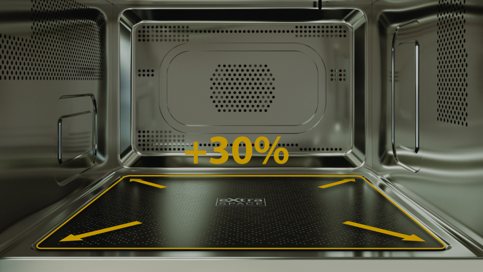 *Comparé à un produit Whirlpool 25 L standard avec plateau tournantSans plateau tournant, vous disposez de 30%* d'espace utilisable supplémentaire. 100% de surface utile jusque dans les angles pour plus de flexibilité et pour cuisiner plus de plats à la fois.