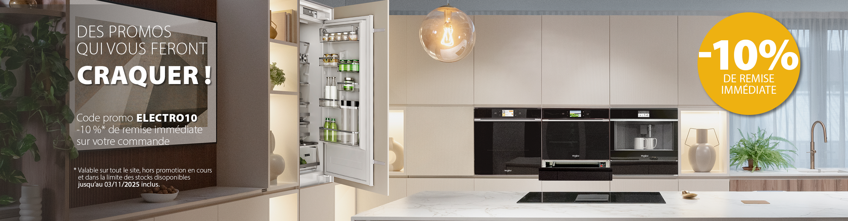 Ne passez plus à côté des meilleures offres du moment ! Avec les promotions Whirlpool, vous bénéficiez de réductions attractives sur tous les indispensables du quotidien. Faites le plein de bonnes affaires électroménager et transformez votre intérieur avec des produits performants, durables et élégants. Besoin d’un lave-vaisselle silencieux, d’un congélateur spacieux ou d’un sèche-linge intelligent ? Utilisez un code promo Whirlpool et profitez d’avantages immédiats. Chaque offre est une opportunité de faire des économies tout en vous équipant avec une marque de confiance. Whirlpool vous simplifie la vie avec des produits pensés pour durer, à des prix accessibles. Trouver de l’électroménager pas cher n’a jamais été aussi simple : il suffit d’un clic pour faire de bonnes affaires. N’attendez plus, les meilleures promos partent vite !