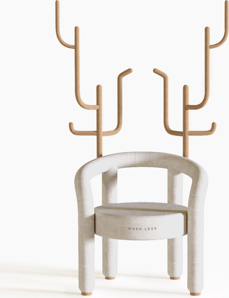 Le projet Wash Less, inspiré par la chaise de la chambre à coucher sur laquelle les vêtements sont souvent entassés avant d'être triés, est conçu dans un souci de durabilité. Conçu par Fabio Novembre et produit par Natuzzi, il ne s'agit pas seulement d'une chaise, mais d'un objet de design fonctionnel et esthétiquement attrayant. Il intègre des matériaux durables et une technologie avancée, avec un cadre en acier durable et un revêtement en Ecoplen®*, un tissu autonettoyant** breveté, fabriqué à partir de bouteilles PET recyclées, qui purifie l'air et élimine les odeurs. Le slogan brodé « Wash Less » encourage les gestes plus responsables au quotidien. La chaise peut également être utilisée comme valet de chambre grâce à une structure sculpturale qui s'étend depuis le dossier, faisant office de porte manteau et libérant des nanoparticules de TiO2 assainissantes pour nettoyer les fibres du tissu. Cette chaise, agrémentée de supports en acier floqué, symbolise notre engagement en faveur de l'environnement. *Ecoplen est une marque déposée dans l'Union européenne, détenue par Francisco Pérez Las (PDG d'Atenzza Outdoor SL), avec le numéro de demande 018868501. Produit par Atenzza Outdoor SL, une entreprise espagnole qui fabrique des tissus techniques pour l'ameublement intérieur/extérieur. Ecoplen® est une marque d'Atenzza Outdoor qui désigne le tissu qui s'autonettoie (si l'origine de la tache est organique) et s'autodésinfecte (champignons, bactéries et virus). **Les taches organiques sont éliminées en exposant simplement le tissu à la lumière. Les taches organiques sont éliminées en exposant simplement le tissu à la lumière du soleil ; le processus de nettoyage prend environ 10 jours. Le tissu doit être exposé directement au soleil pendant 48 à 72 heures pour obtenir des résultats optimaux, avec une exposition recommandée de 10 jours pour une élimination complète.
